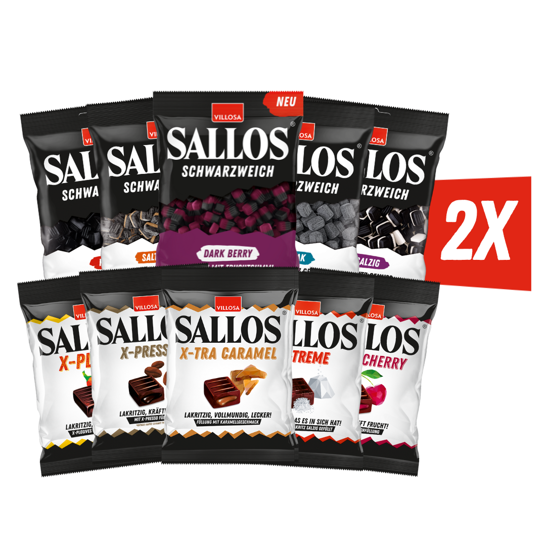 ALLES-DOPPELT-DRIN-BOX: Der Name ist so eindeutig, da müssen wir nicht viel erklären. Du willst SALLOS in allen Facetten, aber ein Beutel reicht dir nicht? Dann ist die ALLES-DOPPELT-DRIN-BOX genau das richtige für dich!